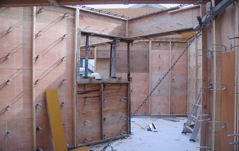 コンクリートを流す部分を型枠で囲い、セパレーターという金具で止めます。