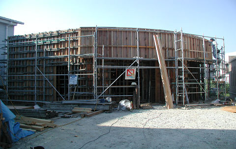 コンクリートの強度が十分に出ていることをテスト用サンプルで確認した後、2階の木造部分を立ち上げます。