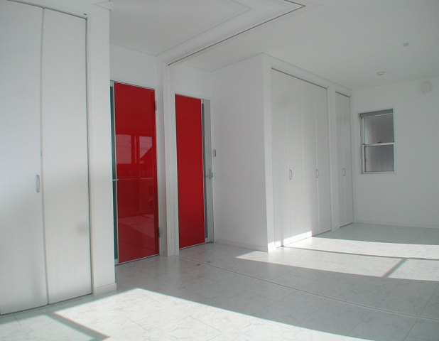 鏡面レッドの扉が空間の白さに映えてとても楽しげな部屋になりました。この建物で唯一、彩度のある部分です。